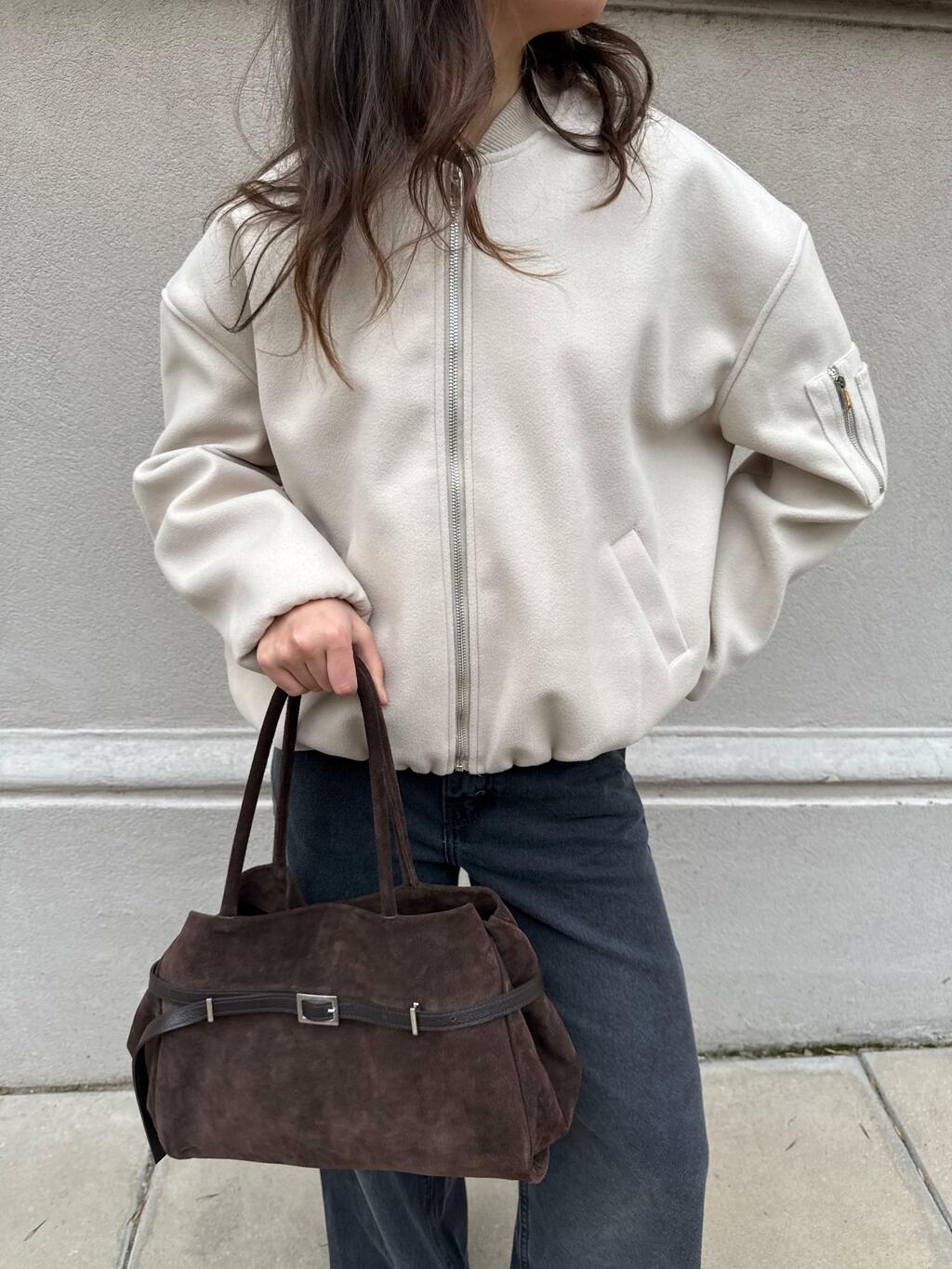 Chaqueta bomber oversize de corte amplio, con terminación fruncida en puños y cintura que define la silueta. Cierre metálico plateado al frente y detalle utilitario de bolsillo con cierre en una de las mangas. Interior completamente forrado al tono.